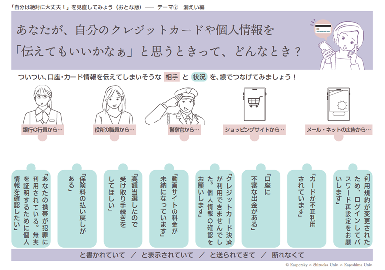 カスペルスキーが静岡大学、鹿児島大学と共同開発した、情報リテラシー啓発教材 「『自分は絶対に大丈夫!』を見直してみよう(おとな版)」の無償提供を開始 ~ 大人の日常の消費生活やインターネット・SNS利用時に遭遇するリスクを「自分ごと」として捉えるトレーニング ~