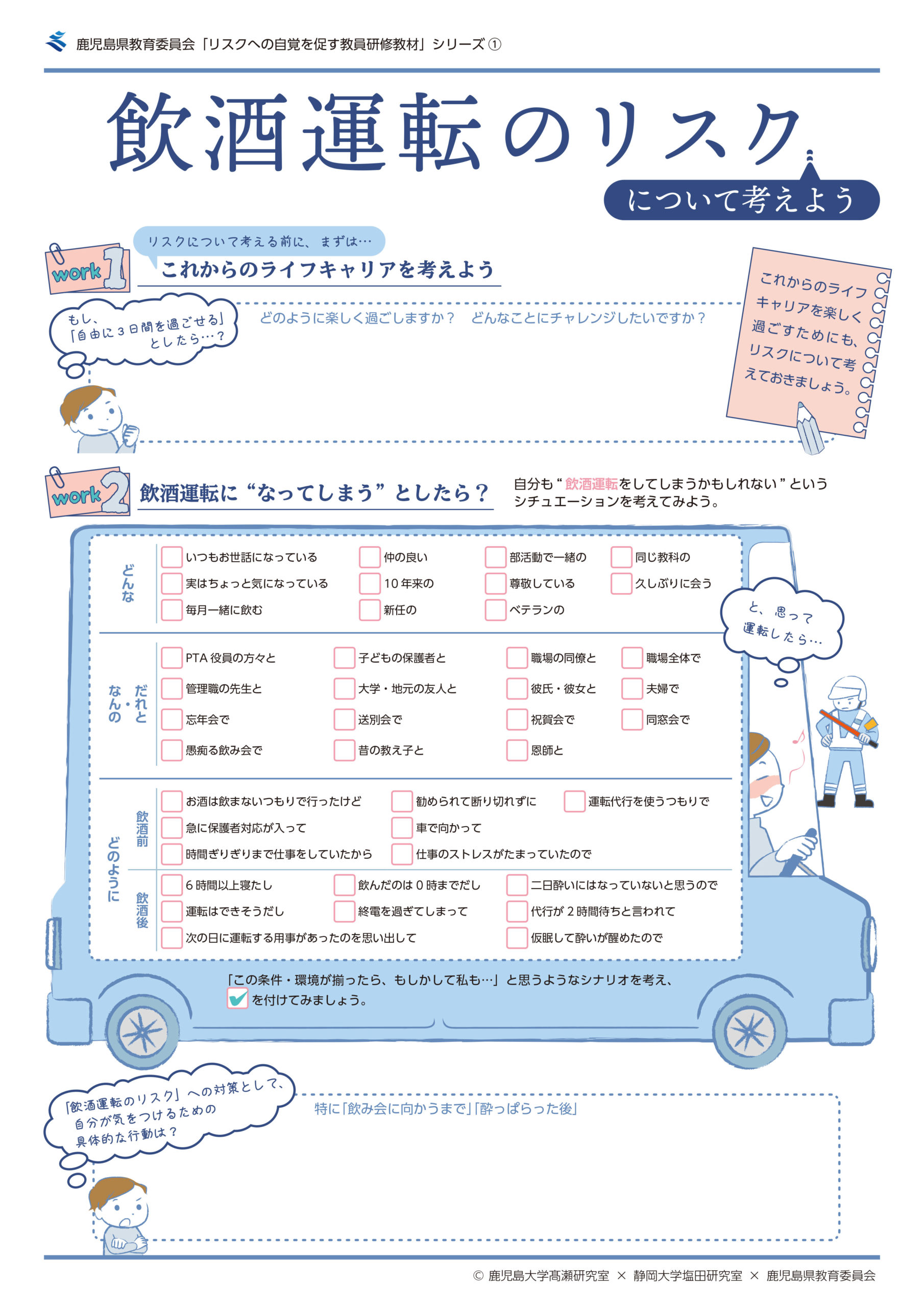 国立大学法人鹿児島大学大学院教育学研究科髙瀬研究室(助教:髙瀬和也)は,国立大学法人静岡大学教育学部塩田研究室(准教授:塩田真吾),鹿児島県教育委員会と共同で,「飲酒運転」「職員間ハラスメント」に続く第0弾として,「教員のライフキャリア」を題材としたリスクへの自覚を促す教員研修教材を開発しました.研修などで利用できる教材一式を本日より提供開始します.