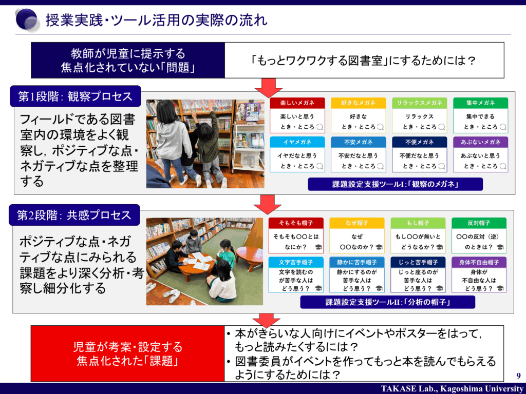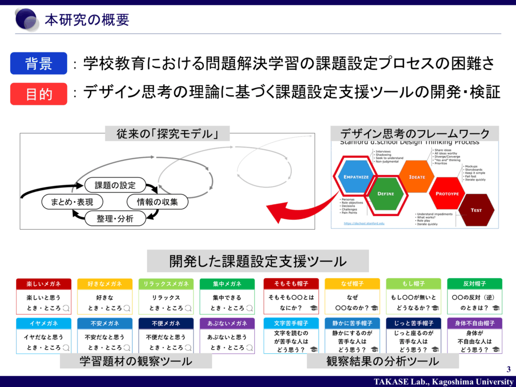 本研究は,デザイン思考における「共感(Empathize)」「問題定義(Define)」のプロセスを,身近な学習対象から問いをつくるという小学校での授業に応用し,その教育効果を課題設定に対する児童の意識や児童の生成する問いの質といった観点から検証するものでありました.